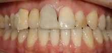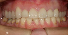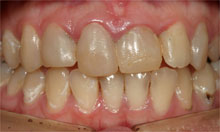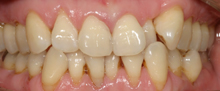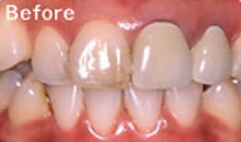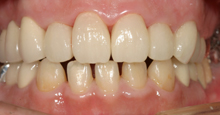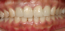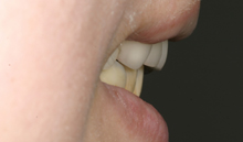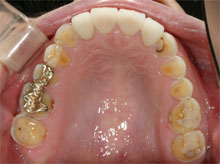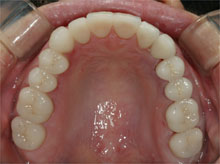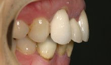 この患者さんは拒食症の為何度も食べたものを吐いていた為上の歯が溶けた症例です。 その為奥歯で物が噛めずいつの間にか下顎が奥に下がり出っ歯になり、又顎関節症を引き起こしてた症例です。前歯はそのままで奥歯のみエンジェルクラウンにて補綴しました。そのお陰で出っ歯は治り、顎関節症も治り、尚且つ奥歯でちゃんと物が噛めるようになりました。